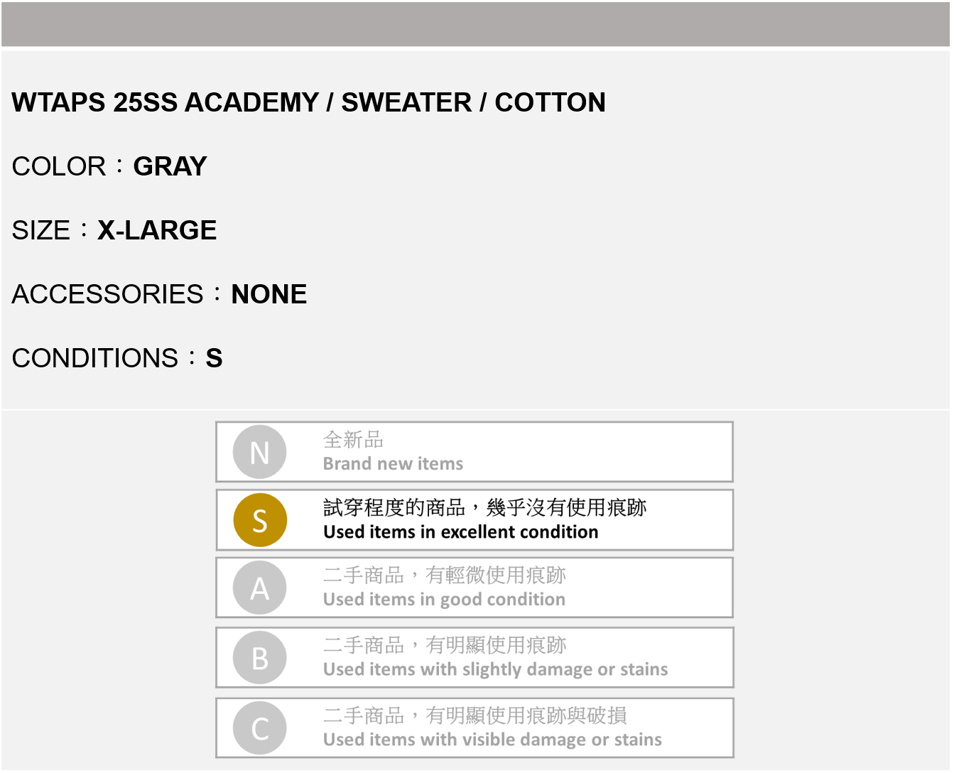 WTAPS 25SS ACADEMY / SWEATER 灰色 XL號
