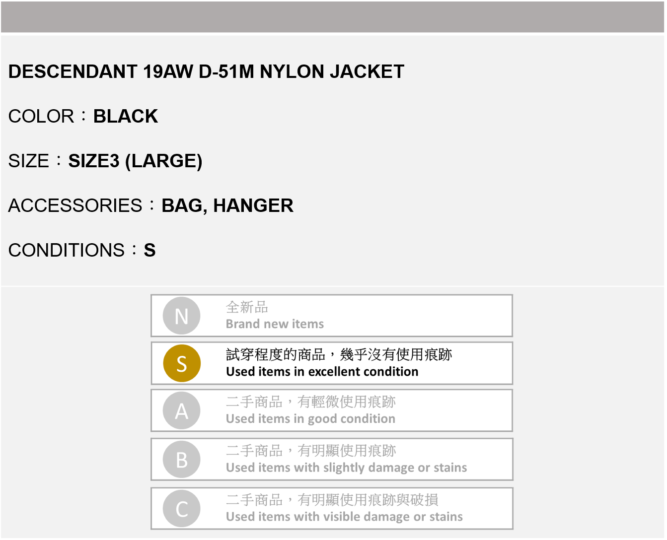 DESCENDANT 19AW D-51M NYLON JACKET 黑色 3號