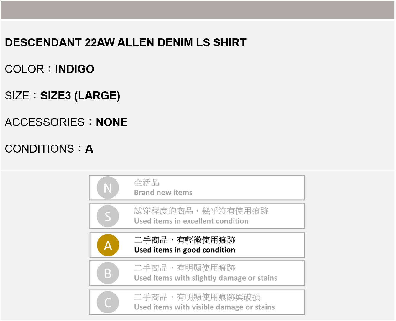 DESCENDANT 22AW ALLEN DENIM LS SHIRT 藍色 3號