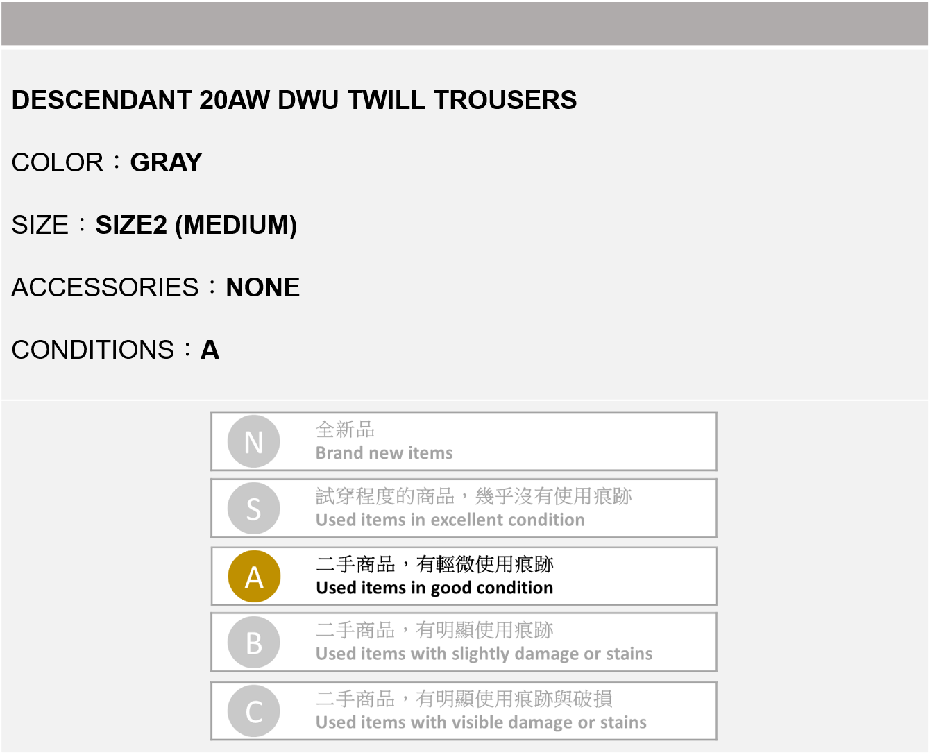 DESCENDANT 20AW DWU TWILL TROUSERS 灰色 2號
