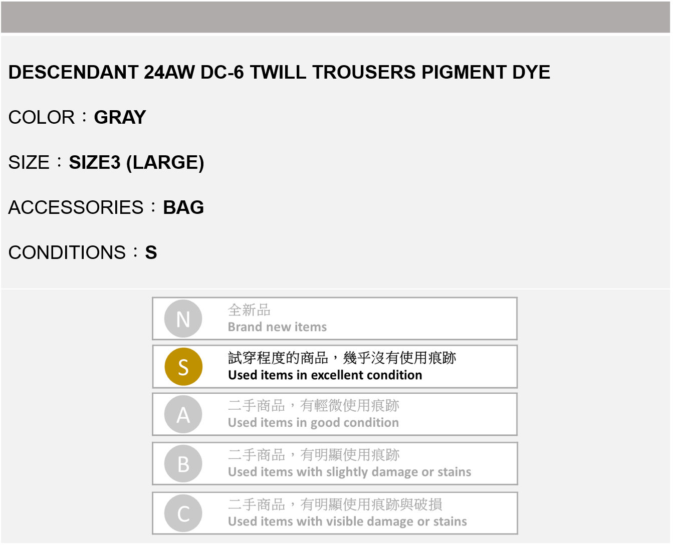 DESCENDANT 24AW DC-6 TWILL TROUSERS PIGMENT DYE 灰色 3號
