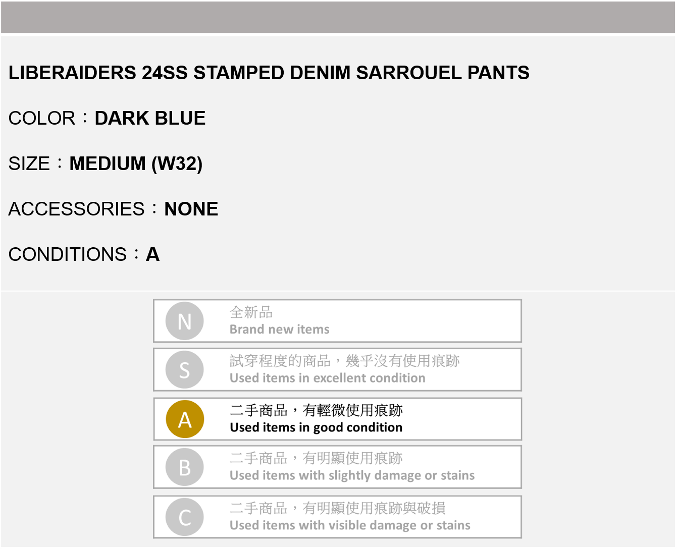 LIBERAIDERS 24SS STAMPED DENIM SARROUEL PANTS 深藍色 M號