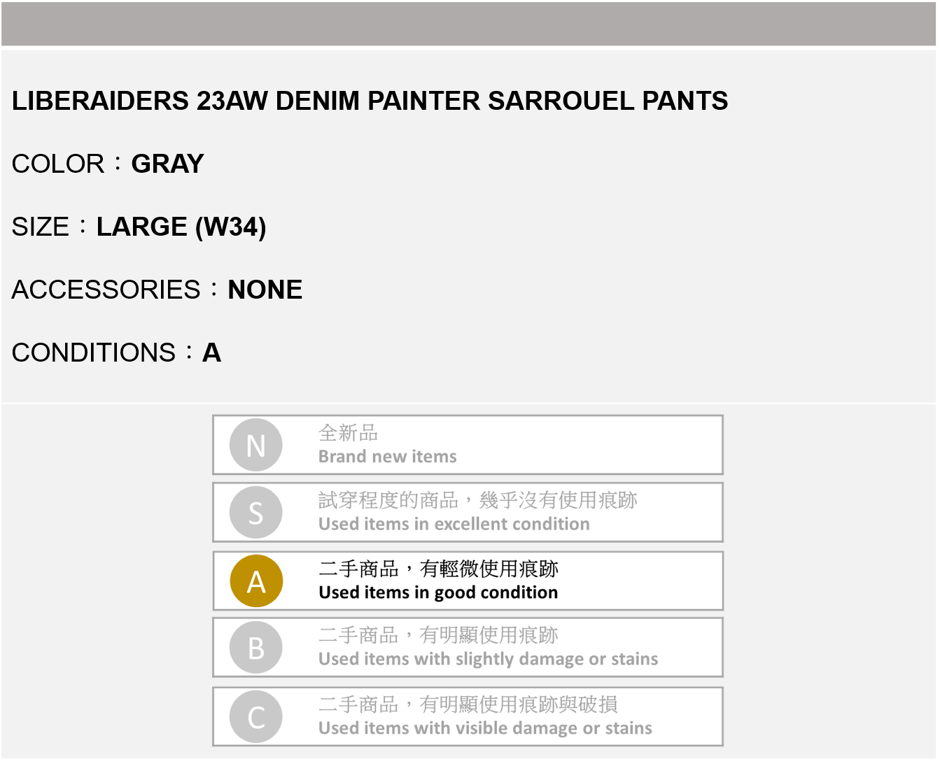 LIBERAIDERS 23AW DENIM PAINTER SARROUEL PANTS 灰色 L號