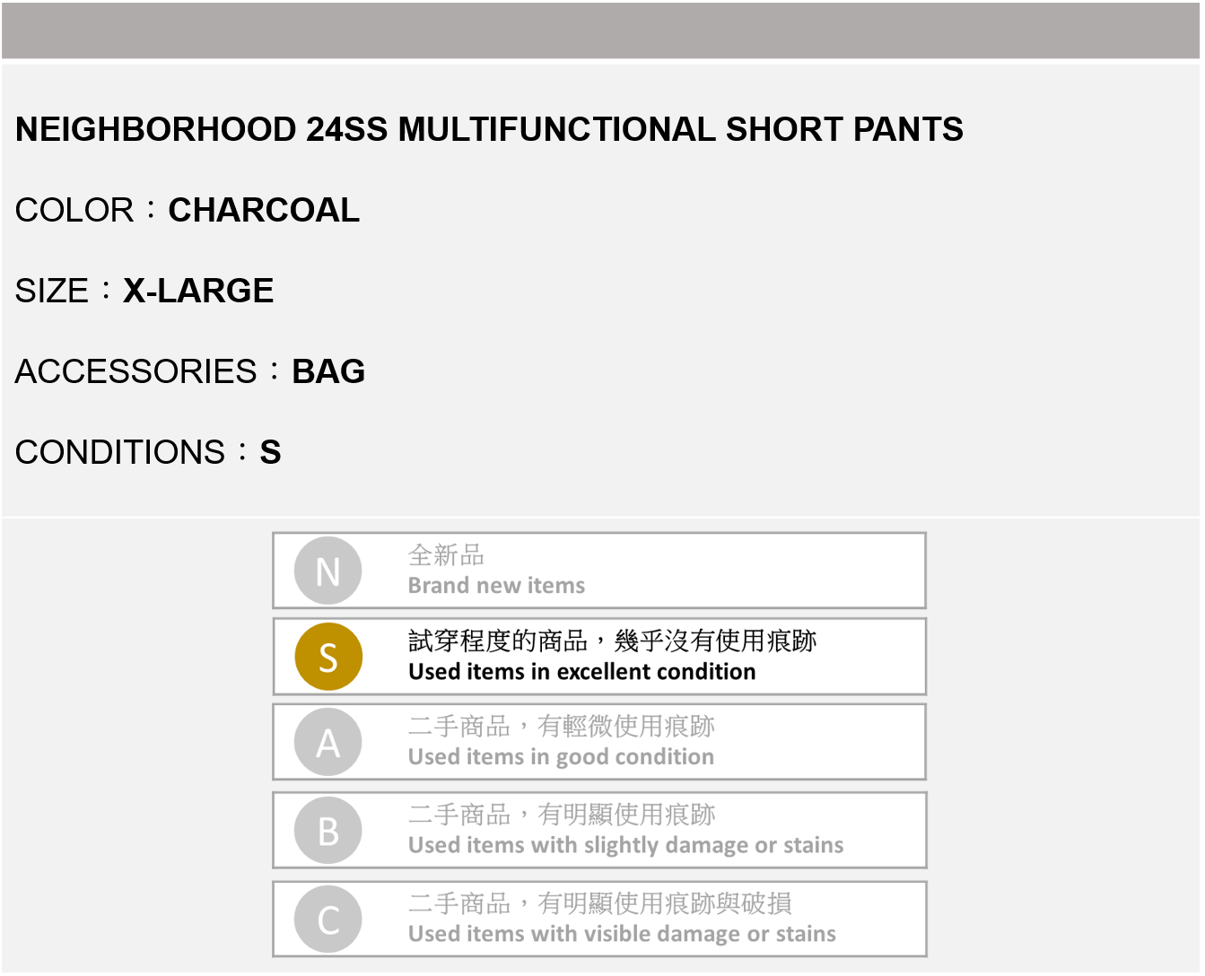NEIGHBORHOOD 24SS MULTIFUNCTIONAL SHORT PANTS 碳黑色 XL號