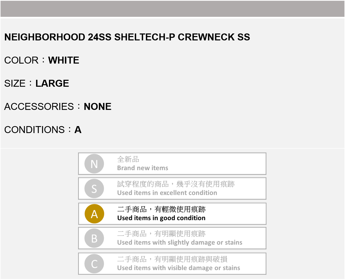 NEIGHBORHOOD 24SS SHELTECH-P CREWNECK SS 白色 L號