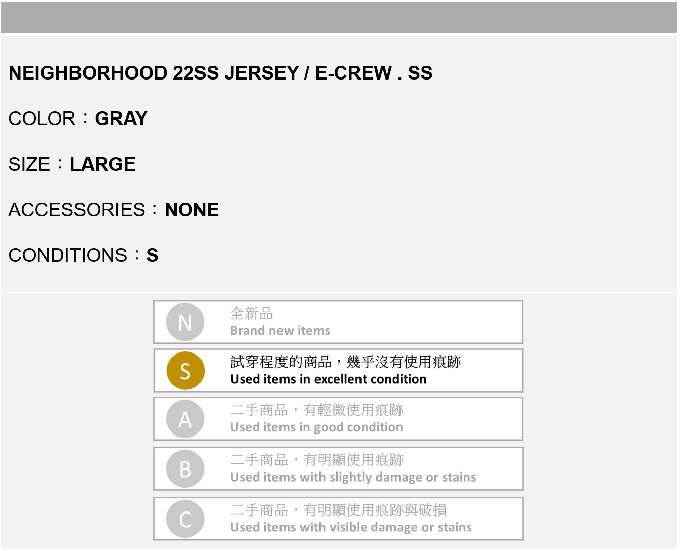 NEIGHBORHOOD 22SS JERSEY / E-CREW . SS 灰色 L號