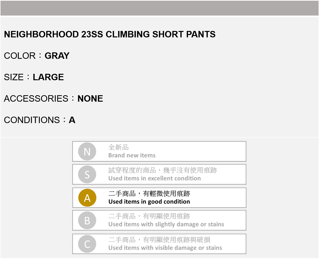 NEIGHBORHOOD 23SS CLIMBING SHORT PANTS 灰色 L號