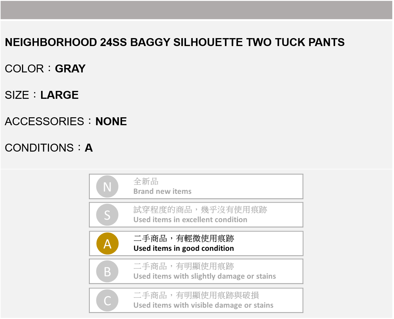 NEIGHBORHOOD 24SS BAGGY SILHOUETTE TWO TUCK PANTS 灰色 L號
