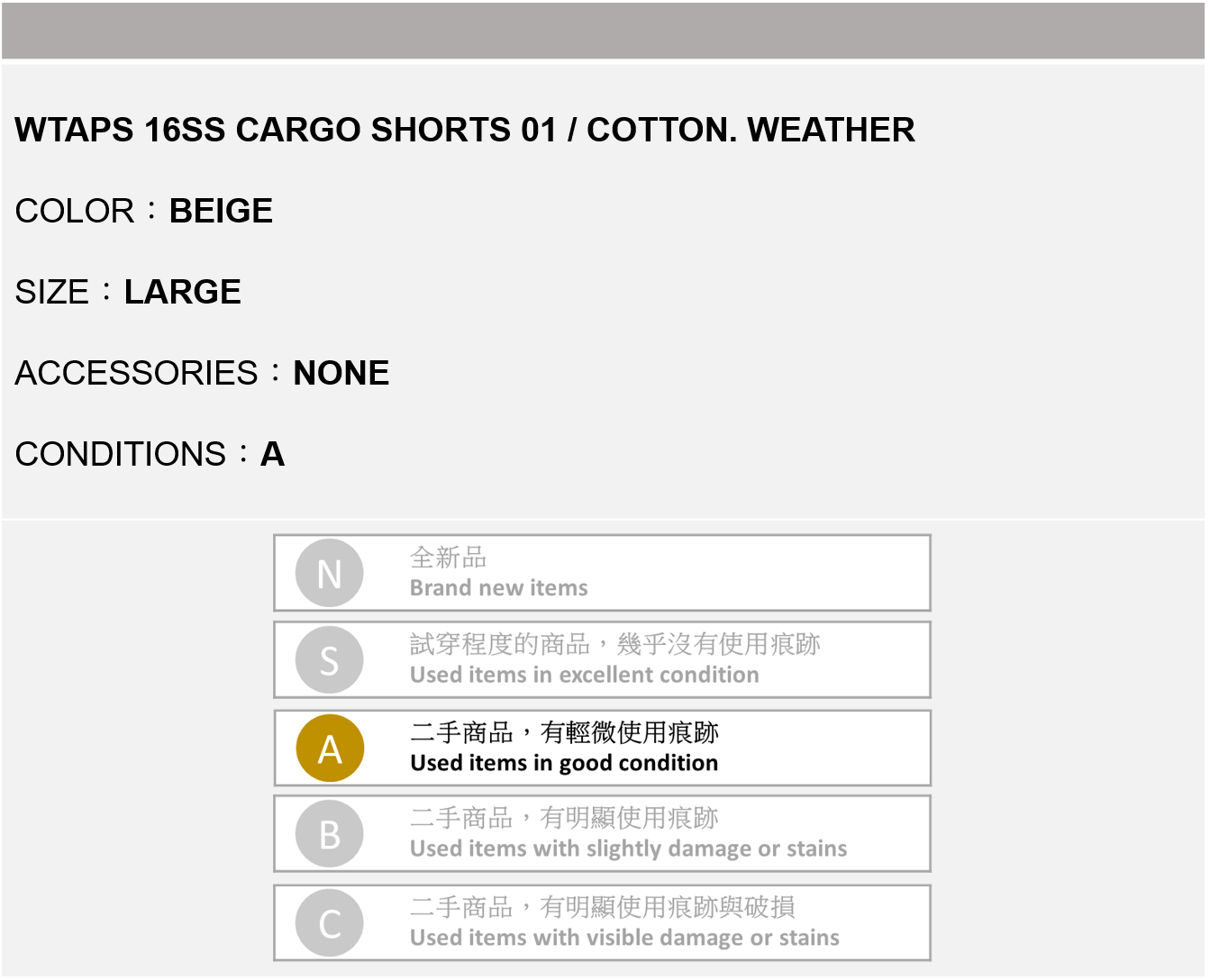 WTAPS 16SS CARGO SHORTS 卡其色 L號
