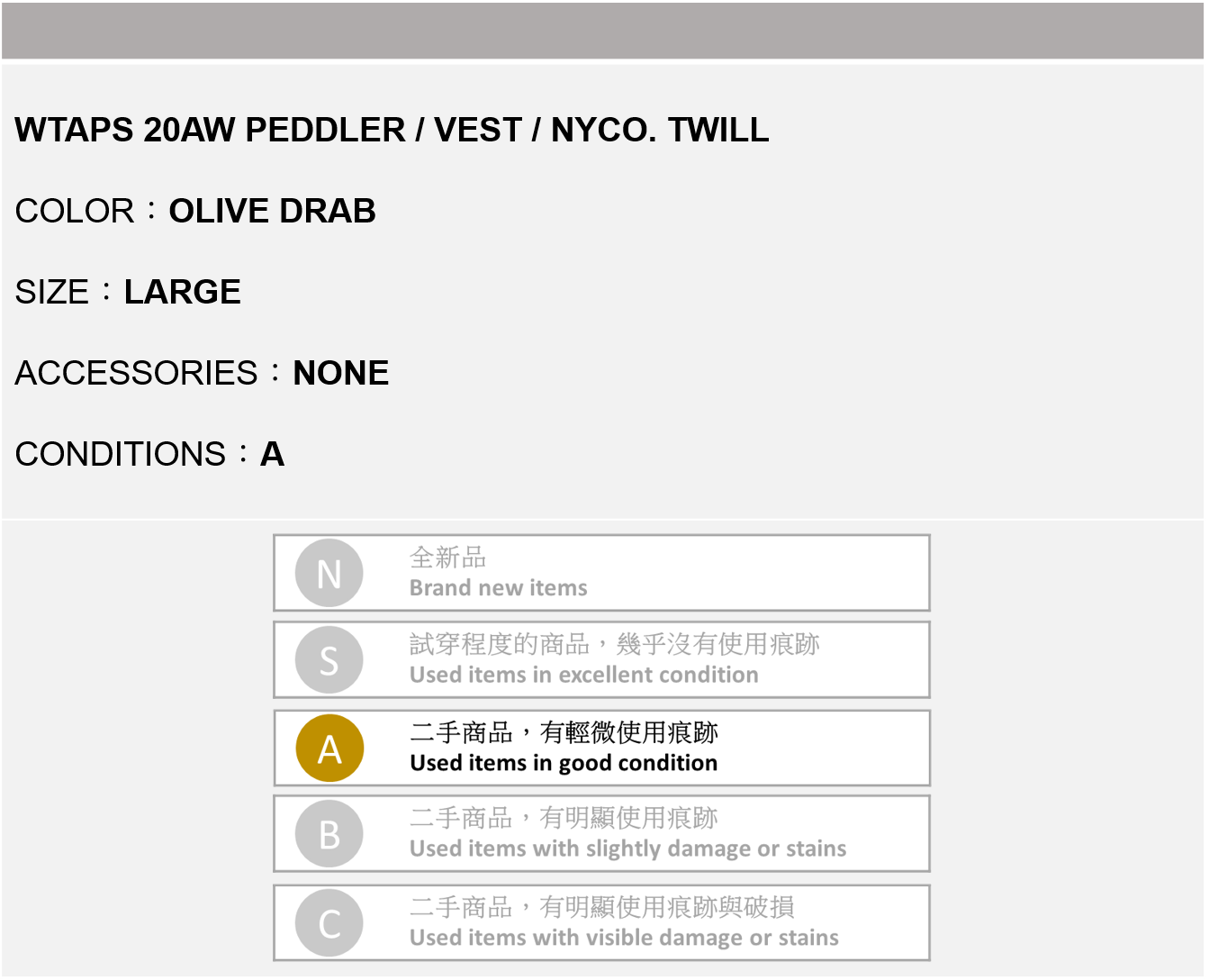 WTAPS 20AW PEDDLER / VEST 軍綠色 L號