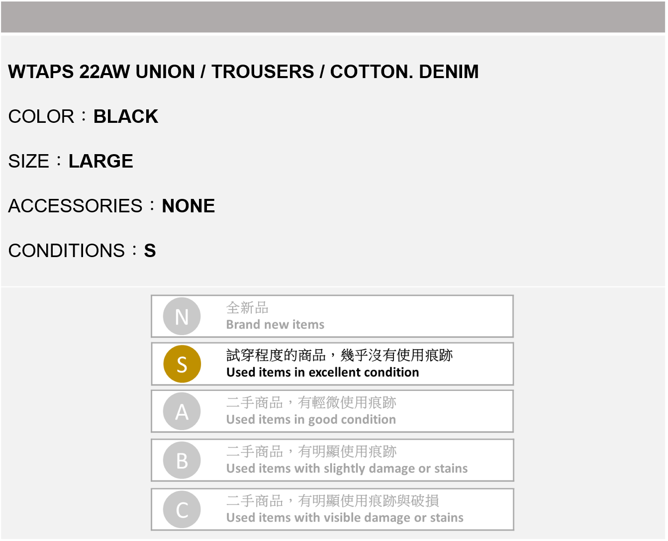 WTAPS 22AW UNION / TROUSERS 黑色 L號