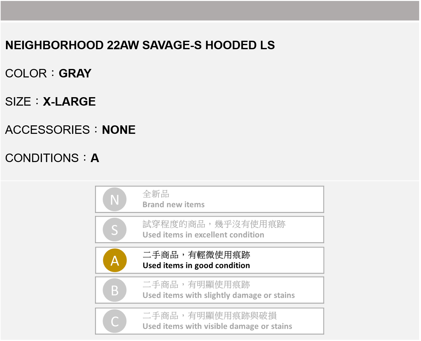 NEIGHBORHOOD 22AW SAVAGE-S HOODED LS 灰色 XL號
